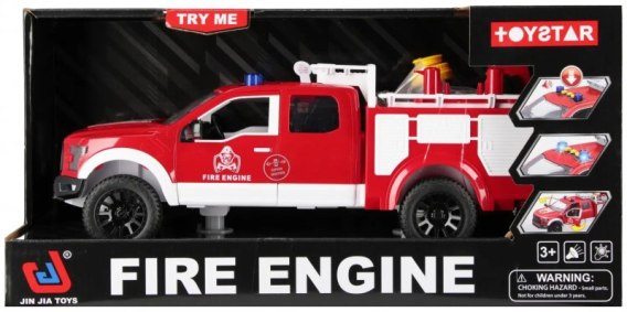 Zawartość zestawu: samochód strażacki z wysuwana drabiną, pojemnik na wodę. Zabawka wykonana z plastiku oraz gumy. Wymiary/waga/baterie: wymiary produktu (dł. x wys. x gł.) [cm]: 35x14x13, wymiary opakowania (dł. x wys. x gł.) [cm]: 41x21x16,