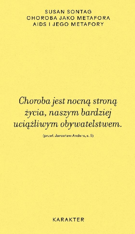 Dwa słynne eseje, które weszły do kanonu humanistyki. Analizując źródła naukowe i utwory literackie od antyku po czasy współczesne (odwołując się choćby do Homera, Baudelaire'a, Manna, Joyce'a czy Audena) Susan Sontag rekonstruuje mitologię gruźlicy i choroby nowotworowej. Pokazuje przy tym sposoby, w jakie społeczeństwo stygmatyzuje chorych i demistyfikuje ideologiczne fantazmaty, które zmierzają do demonizacji niektórych chorób. Drugi esej, napisany pod koniec lat 80., jest pionierską analizą AIDS i społecznych wyobrażeń, jakie towarzyszyły pojawieniu się tej choroby.