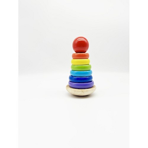 Drewniana piramidka z kolorowymi obręczami i nakładaną kulą.