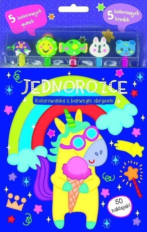 Dzieci znajdą w nim kolorowanki z barwnym obrysem, 5 kolorowych kredek oraz 5 kolorowych gumek.