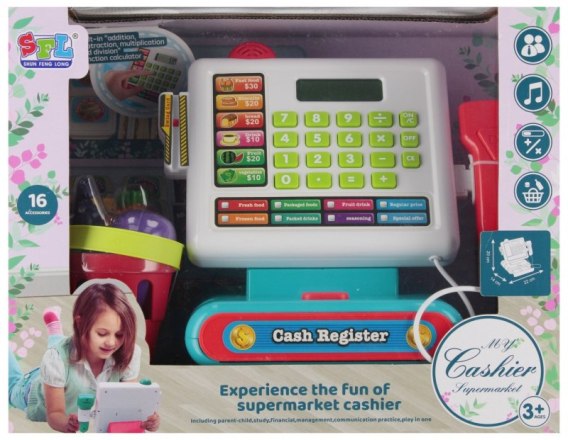 Zalety produktu kasa sklepowa mały supermarket z 16 akcesoriami, wyposażona jest we wszystko czego potrzebuje sprzedawca koszyk z artykułami spożywczymi, dzięki czemu zabawa jest atrakcyjniejsza, kasa posiada efekty dźwiękowe, czytnik skanerem produktów przy kasie wydającym efekt dźwiękowy odzwierciedlając prawdziwy, kasa z wyświetlaczem i czytnikiem kart.