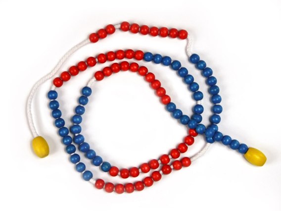 Korale matematyczne 100 to drewniane korale o średnicy 11 mm, nawleczone dziesiątkami na przemian w kolorze czerwonym i niebieskim na porowaty sznurek. Dzięki temu korale nie przesuwają się same i nawet trzymając sznurek w pionie można ustawiać je w dowolnej pozycji.