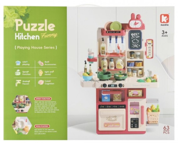 Cechy produktu: zlew z obiegiem wody, efekt przelewania, bogaty zestaw akcesoriów tj. garnki, naczynia, sztućce, produkty spożywcze, rozwija kreatywność, zdolności manualne i wyobraźnię, uczy odgrywania ról i samodzielności, zapewnia godziny wciągającej zabawy, idealny pomysł na prezent dla małych miłośników gotowania.