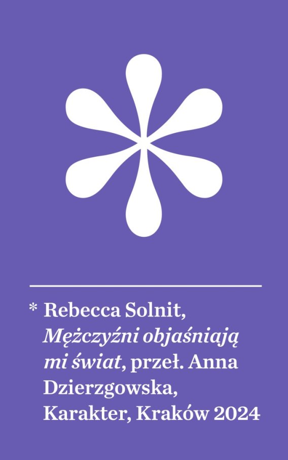 Zaczyna się niewinnie, od czegoś, co przy pewnej dozie dobrej woli można by uznać za towarzyską niezręczność. Podczas przyjęcia pan domu nie przyjmuje do wiadomości, że rozmawia z autorką książki, którą właśnie jest jej łaskaw objaśniać. Rebecca Solnit widzi jednak w tym zdarzeniu coś więcej, coś, z czym stykają się na co dzień miliony kobiet na świecie: przejaw symbolicznej przemocy ze strony mężczyzn, emanację patriarchalnego systemu, w którym funkcjonujemy. To jednak zaledwie czubek góry lodowej - autorka opowiada o innych zdarzeniach (często obficie relacjonowanych przez media), w których ujawnia się symboliczna lub nawet fizyczna przemoc wobec kobiet (w Stanach Zjednoczonych co 6 minut zgłaszany jest gwałt, a są to bardzo zaniżone statystyki). Jednocześnie Solnit wpisuje sytuację i prawa kobiet w szerszy geopolityczny i kulturowy kontekst. Przywołuje też dwie inne wybitne eseistki: Virginię Woolf i Susan Sontag, z którymi podejmuje dialog i polemizuje. Lekki styl i bystrość wywodu sprawiają, że od tekstów Solnit trudno się oderwać. Z pewnością powinny one dać do myślenia zarówno kobietom, jak i mężczyznom - są aktualne aż do bólu.