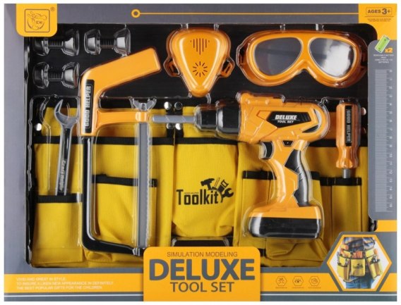 Zawartość zestawu: pas na narzędzia, piła ręczna, okulary + maska ochronna, wiertarka, śrubokręt, klucz, 3x śrubki + nakładki.