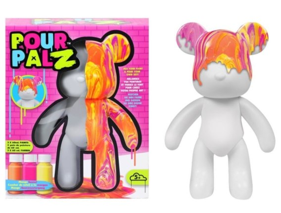 Poznaj świat kreatywnej zabawy z Pour Palz - wyjątkowymi designerskimi figurkami, które malujesz samodzielnie! W każdym opakowaniu znajdziesz uroczego misia i kolorowe farby, którymi możesz go ozdobić, jak tylko chcesz. Wlej, pomaluj, wysusz - i gotowe! Twój miś, Twój styl!