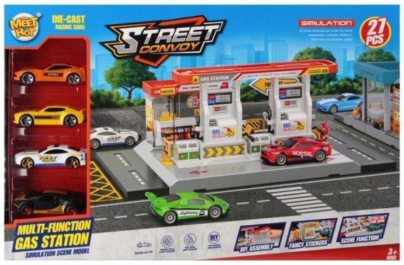 Zawartość zestawu: parking/stacja benzynowa, 4 x samochody.