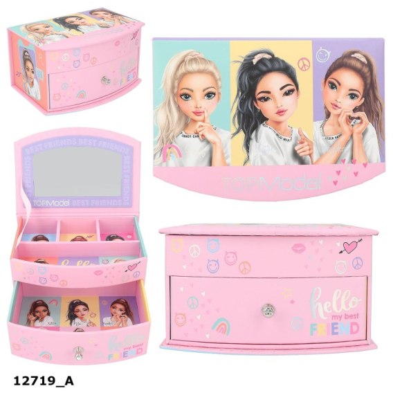 Szkatułka na biżuterię Top Model, z lusterkiem na wieczku, podział na 4 przegródki na górze, szufladka na drobiazgi na dole.