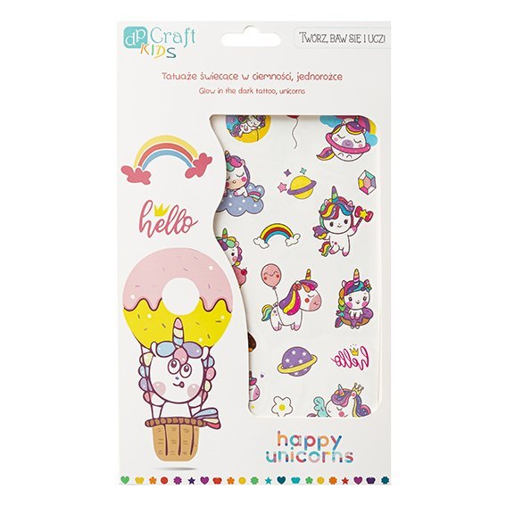 Dodaj odrobinę magicznego blasku do zabawy dzięki naszym świecącym w ciemności tatuażom z wzorem jednorożców najpopularniejszego, dziecięcego motywu!