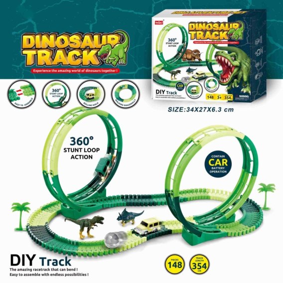 Dinosaur Track tor wyścigowy z pętlami i dinozaurami (148 elementów) to wyjątkowa zabawka dla małych miłośników przygód i prehistorycznego świata! Elastyczny tor o długości aż 354 cm można dowolnie wyginać i układać, tworząc zaskakujące trasy z zakrętami, pętlami i przeszkodami. W zestawie znajduje się samochodzik terenowy, realistyczne figurki dinozaurów, palma, ruchomy mostek oraz efektowna kula do zderzeń.