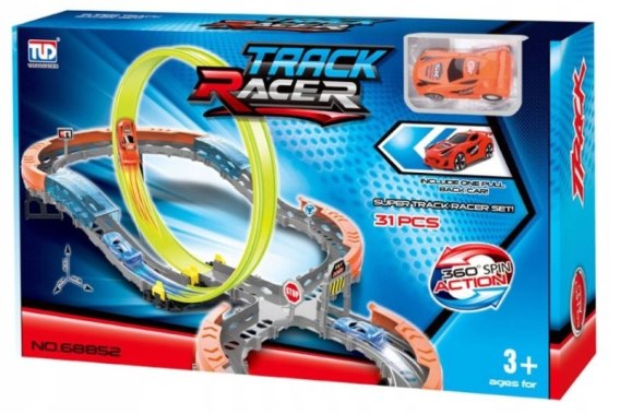 Tor wyścigowy z pętlą o długości 230 cm, składający się z 31 elementów toru oraz jednego samochodzika z napędem typu pull-back.