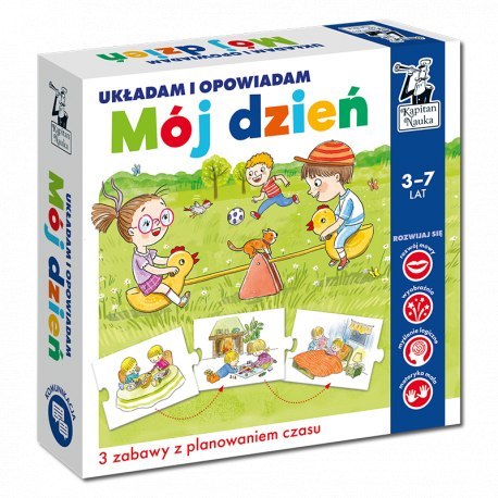 Układam i opowiadam Mój dzień (3-7 lat) to układanki obrazkowe dla przedszkolaków, którzy chcą wiedzieć, co i kiedy się zdarzy, oraz mieć wpływ na swój plan dnia czy tygodnia. Zestaw zawiera 24 dwustronne puzzle, które można łączyć w dowolny sposób. Dziecko ma zatem do dyspozycji aż 48 scenek ukazujących codzienne czynności, zabawy czy atrakcje, z których może ułożyć swój zwykły rozkład dnia albo stworzyć plan na wyjątkową okazję. Układanie historyjek zachęca do opowiadania, relacjonowania wydarzeń i wyrażania uczuć. Można snuć opowieści z własnej perspektywy lub wcielić się w towarzysza przygód i spróbować opisać tę samą sytuację inaczej.