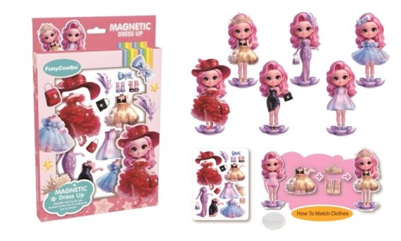 Elementy garderoby są wykonane w formie magnesów, które łatwo dopasować do sylwetki laleczki, dzięki czemu dzieci rozwijają zdolności manualne oraz uczą się koordynacji i wyobraźni przestrzennej.