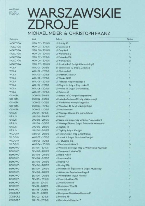 Warszawa jest położona na pokładach wody uwięzionej blisko dwieście metrów pod powierzchnią ziemi, między skałami pochodzącymi z okresu Oligocenu. W latach dziewięćdziesiątych na terenie miasta powstało blisko sto ujęć wody oligoceńskiej, które stanowiły istotny element infrastruktury miejskiej. Częścią miejskiego krajobrazu stał się widok ludzi noszących ze sobą kanistry. Mogli napełniać je za darmo - dostęp do wody oligoceńskiej jest bowiem dobrem publicznym. W przeciwieństwie do wody z kranu, która była silnie chlorowana i miała nieprzyjemny zapach, ludzie wierzyli, że woda filtrowana przez skały pochodzące z okresu Oligocenu, mająca ponad dwadzieścia pięć milionów lat i składająca się z jeszcze starszych atomów wodoru, jest wyjątkowa i posiada właściwości uzdrawiające. Obecnie jednak jakość „kranówki" znaczenie wzrosła. Praktyka korzystania z wody oligoceńskiej podupada, a wiele budynków z ujęciami jest zamykanych i popadają w ruinę. Artystyczny duet Michael Meier & Christoph Franz dokumentuje ten przejściowy stan zanikania, zbierając wodę z ponad osiemdziesięciu czynnych jeszcze studni. Instalacja „Zdrój wody oligoceńskiej" przybiera formę kontenera czy zamkniętej kapsuły wkopanej w ziemię na terenie parku przed CSW. Ze skrupulatnością archiwisty artyści zebrali wodę pochodzącą z ponad osiemdziesięciu czynnych jeszcze zdrojów. Jest to próba stworzenia „biblioteki" składającej się z próbek pochodzących z każdego z ujęć, a także symboliczny gest ochrony zanikającej praktyki kulturowej. Integralną częścią projektu jest książka „Warszawskie zdroje" wydana wspólnie z Fundacją Bęc Zmiana. Publikacja włączy w sobie zarówno część artystyczną w formie dokumentacji fotograficznej architektury istniejących zdrojów, jak i ma charakter varsavianistyczny. Przedstawia akwarystyczne aspekty historii Warszawy, a także przygląda się praktyce picia „oligocenki" okiem antropologa kultury. Do współtworzenia „Warszawskich zdrojów" zaproszeni zostali badacze miasta - Włodzimierz Karol Pessel oraz Martyna Obarska - a także architekci ujęć, ich zarządcy oraz użytkownicy. Projekt graficzny publikacji został stworzony przez Błażeja Pindora.
