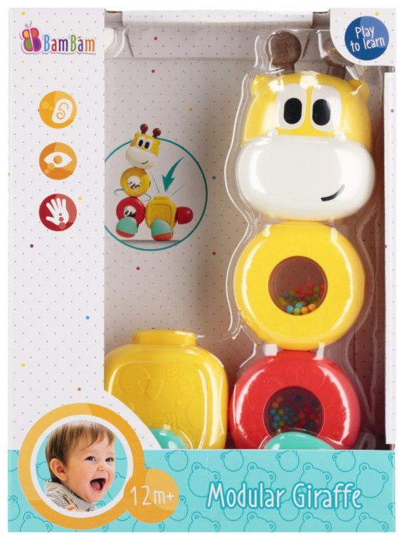Cechy produktu: modułowa budowa zabawki możliwość łączenia i wymiany części, atrakcyjny design w formie żyrafki, bezpieczne, solidne materiały, odpowiednie dla dzieci, elementy idealnie dopasowane do małych rączek.
