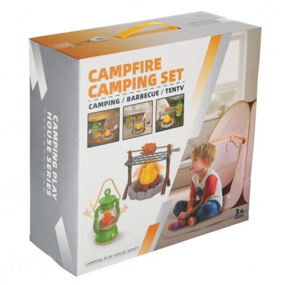 Zawartość zestawu: namiot, lampa ogrodowa, ognisko, art. spożywcze tj. kurczak, ryba, konserwy, sól, pieprz, warzywa i owoce ,akcesoria do grillowania. Wszystkie akcesoria wykonane z plastiku i materiału i są imitacja prawdziwych.