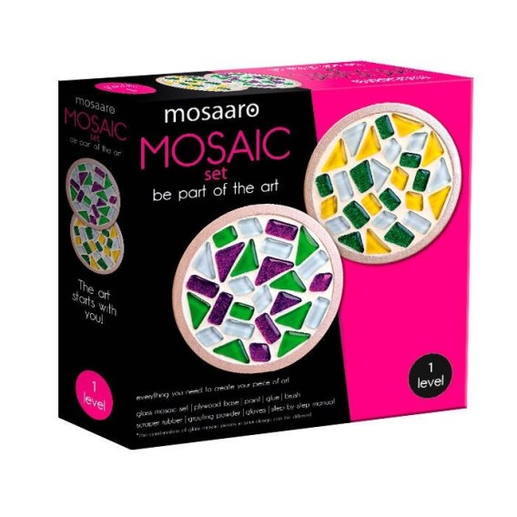 Zestaw zawiera: podstawy, kaboszon, mozaikę, zestaw klejów mocujących, farbę akrylową, szczotkę, gumową szpatułkę, mieszankę do spoinowania fug, drewniany patyk, rękawicę, gąbkę, pojemnik pomiarowy, komplet mocowań, instrukcję krok po kroku